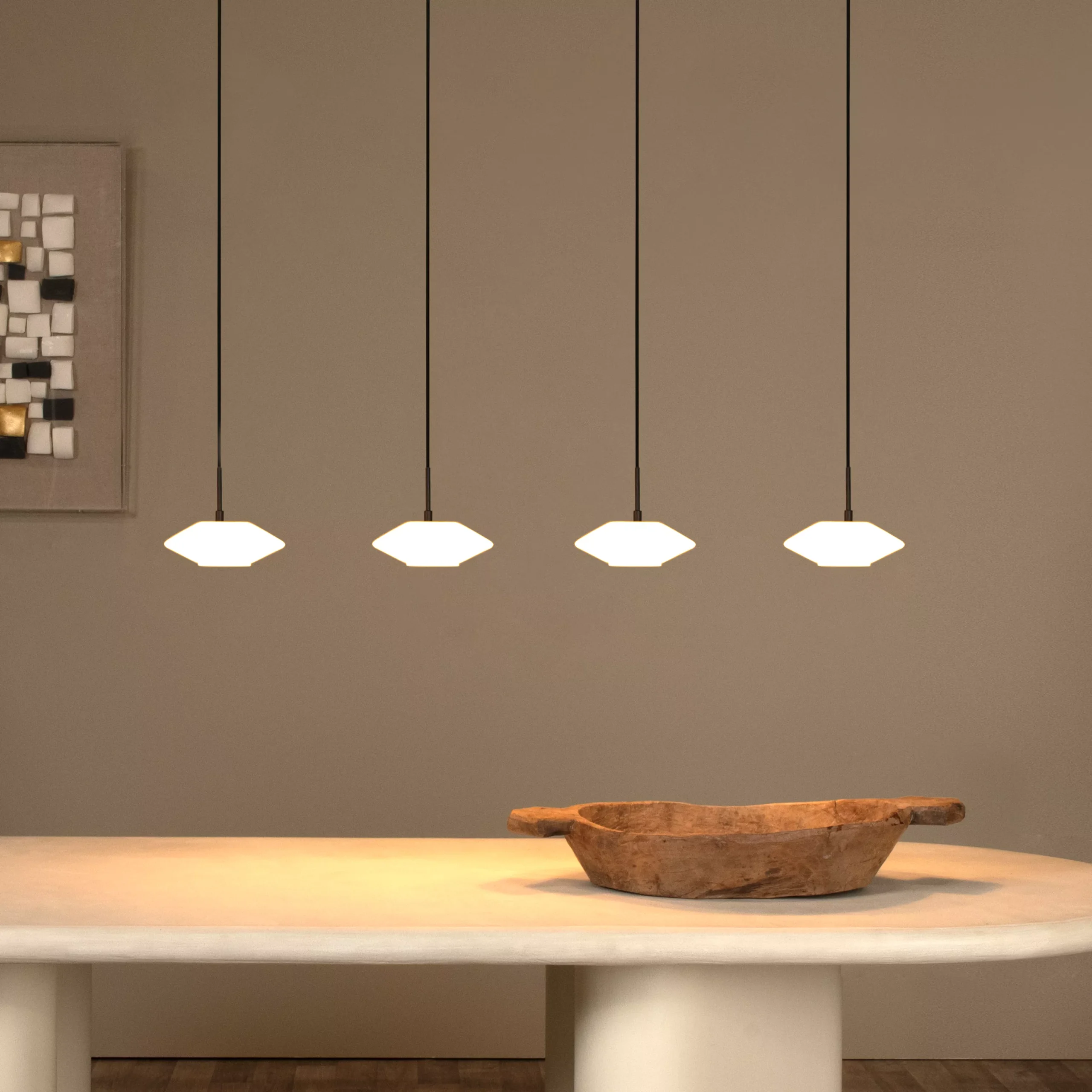 Trevor exudes class and quality. These four compact ceiling pendants arranged in a row have a modern, minimalist design and can each be adjusted in height. The geometric shapes are perfect for any room in the house. From the dining room to the hallway to the bedroom, whatever your decor, this playful, high-quality glass pendant is an elegant eye-catcher that radiates warmth and comfort, providing a pleasant, soft light. And if you connect Trevor to a dimmer, you can add a touch of atmosphere to the list of features.